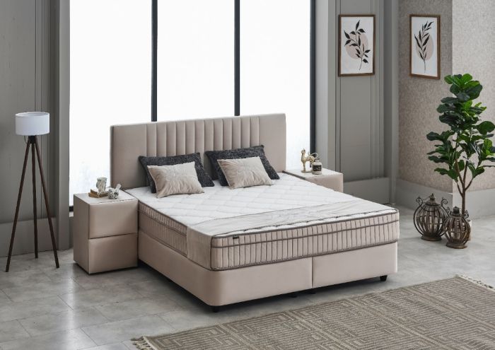 Boxspring postelja LUCIA - Kakovostna box postelja LUCIA v barvi taupe, z letvenim dnom in kvalitetno vzmetnico.