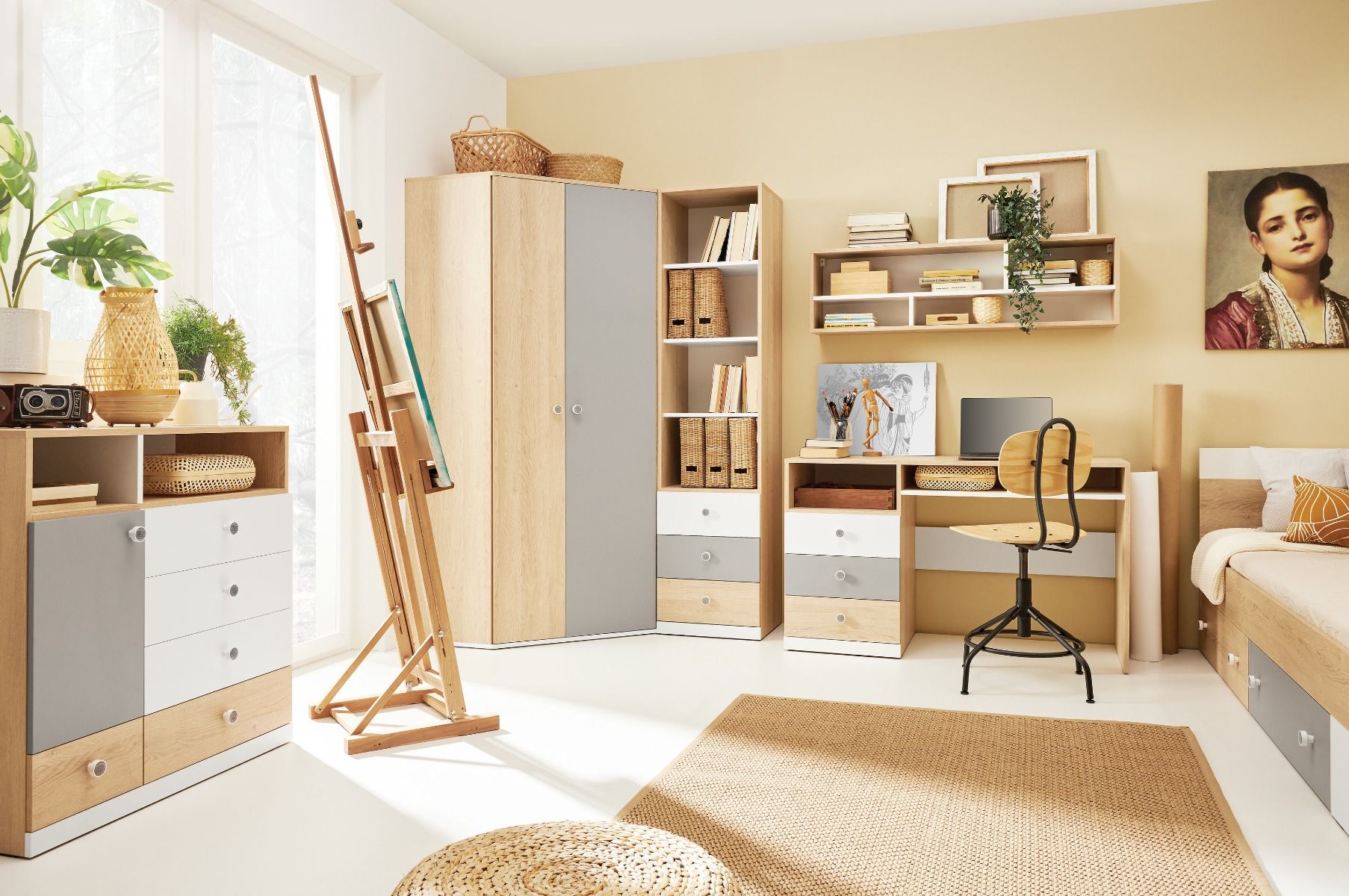 Mladinska soba mora biti urejena, vendar ne sterilna. Pomagajte mladostniku vzdrževati red z dovolj shranjevalnega prostora, a hkrati dovoljujte nekaj ustvarjalnega kaosa, ki spodbuja kreativnost. Pohištvo mladinske sobe Pixel ponuja veliko različnih omar in poličnikov, kateri omogočajo idealno zapolnitev prostora z dovolj prostora za shranjevanje.