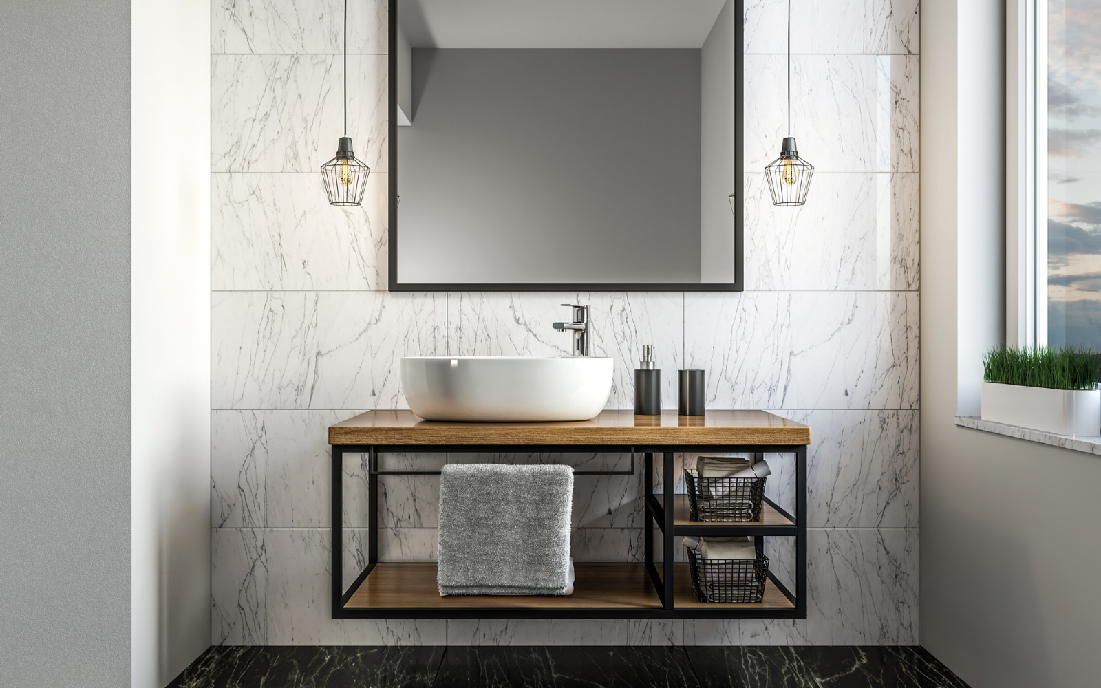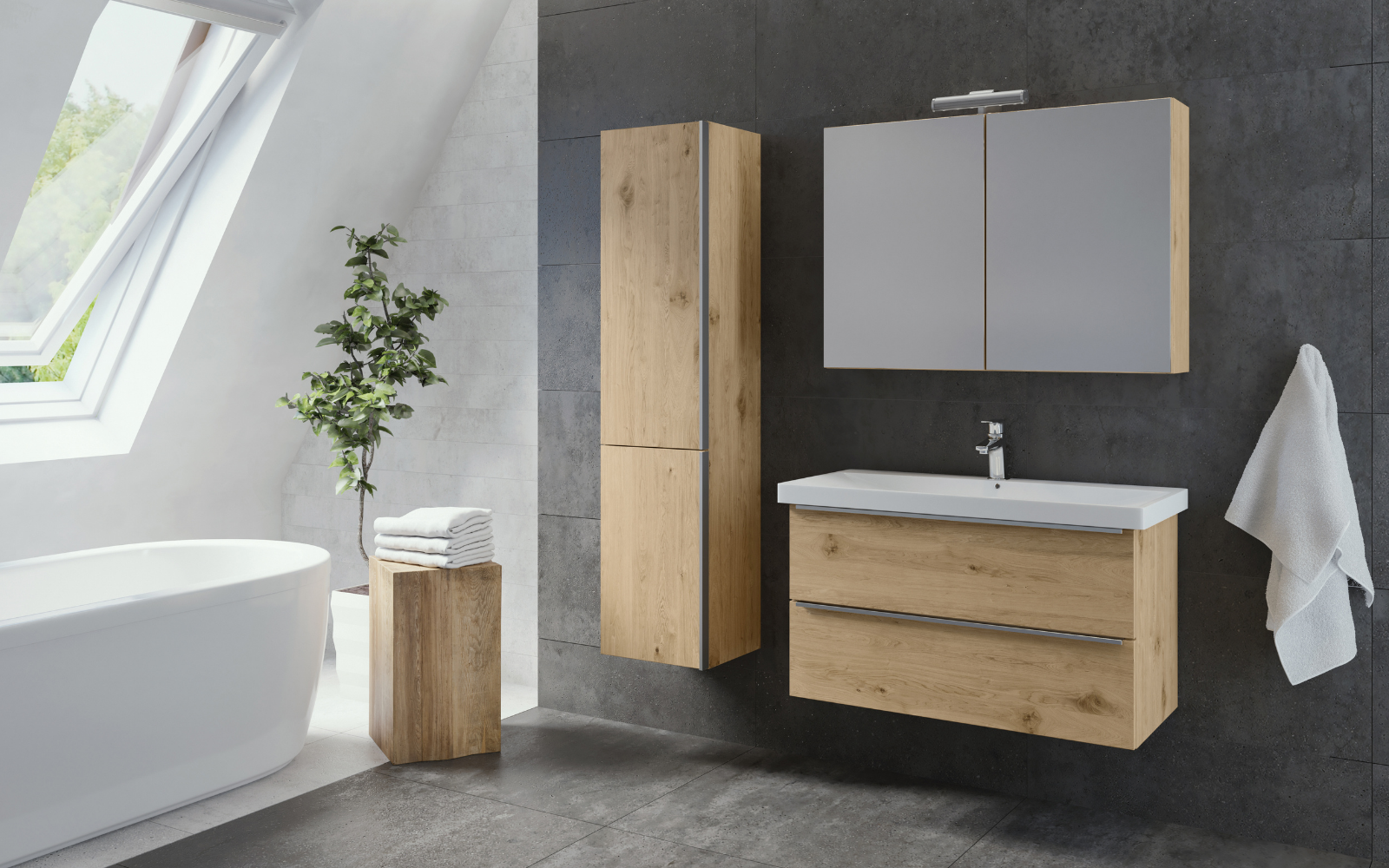 Ko imate izbrano obvezno opremo ki vključuje umivalnik, tuš kabino ali tuš kad in straniščno školjko, je potrebno izbrati še kopalniško pohištvo. Pohištvo naj bo izbrano glede na velikost kopalnice, barvo keramike, naravno in/ali umetno svetlobo. Priporočljivo je, da izberete viseče pohištvo. To vam bo olajšalo vzdrževati čistočo, talna površina je prosta in tudi kopalnica bo vizualno večja. Pri opremljanju je potrebno začeti s prostorom pred katerim postojimo največ časa – pred umivalnikom. Preden izberete le tega, je potrebno izbrati ustrezno pohištvo kamor ga boste postavili. Lahko izberete samostojno omarico brez umivalnika ali pa kopalniško bazo z vgrajenim umivalnikom. Če je prihranek na prvem mestu, se lahko odločite za nakup kopalniških kompletov , ki vključujejo omarico, umivalnik, ogledalo in osvetlitev. Ljubitelji minimalističnega stila se lahko odločite za stenski umivalnik v kombinaciji z minimalistično oblikovano opremo. | ![]() |