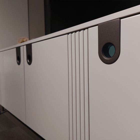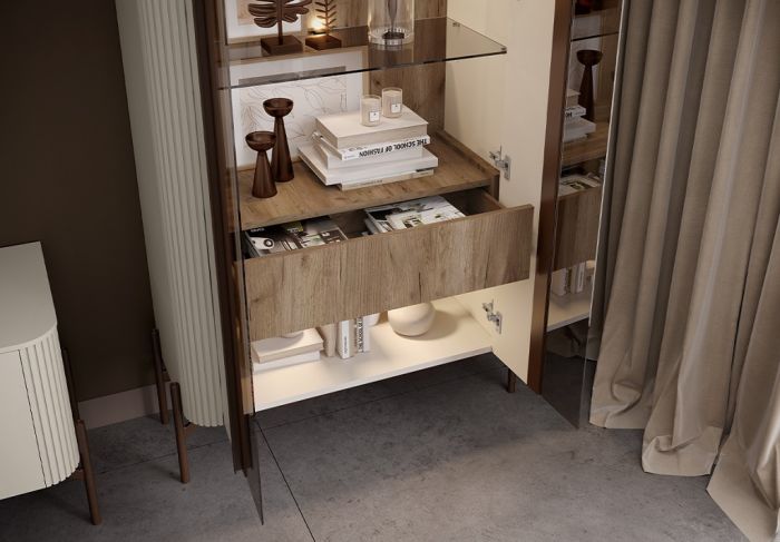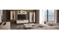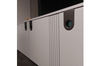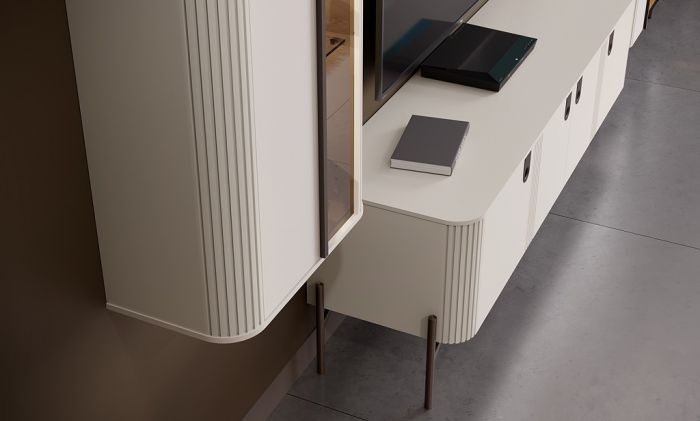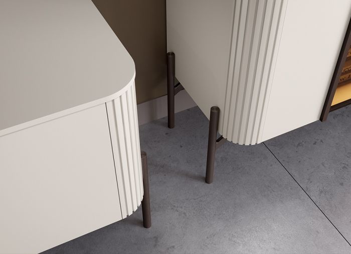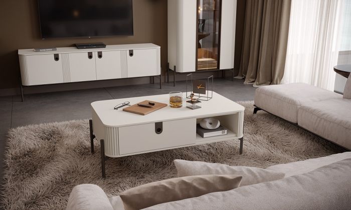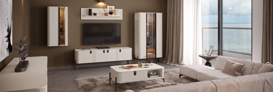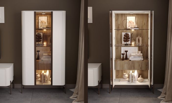 Serija Rondo izstopa s svojimi mehko zaobljenimi linijami, kar ji daje eleganten in sodoben videz. Bela barva v kombinaciji z naravnim lesnim dekorjem prinaša svetlost in toplino, ki sta ključni za prijeten ambient doma. Poudarek je na minimalističnem, a hkrati domačem dizajnu, ki sledi sodobnim trendom notranje opreme.