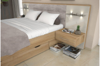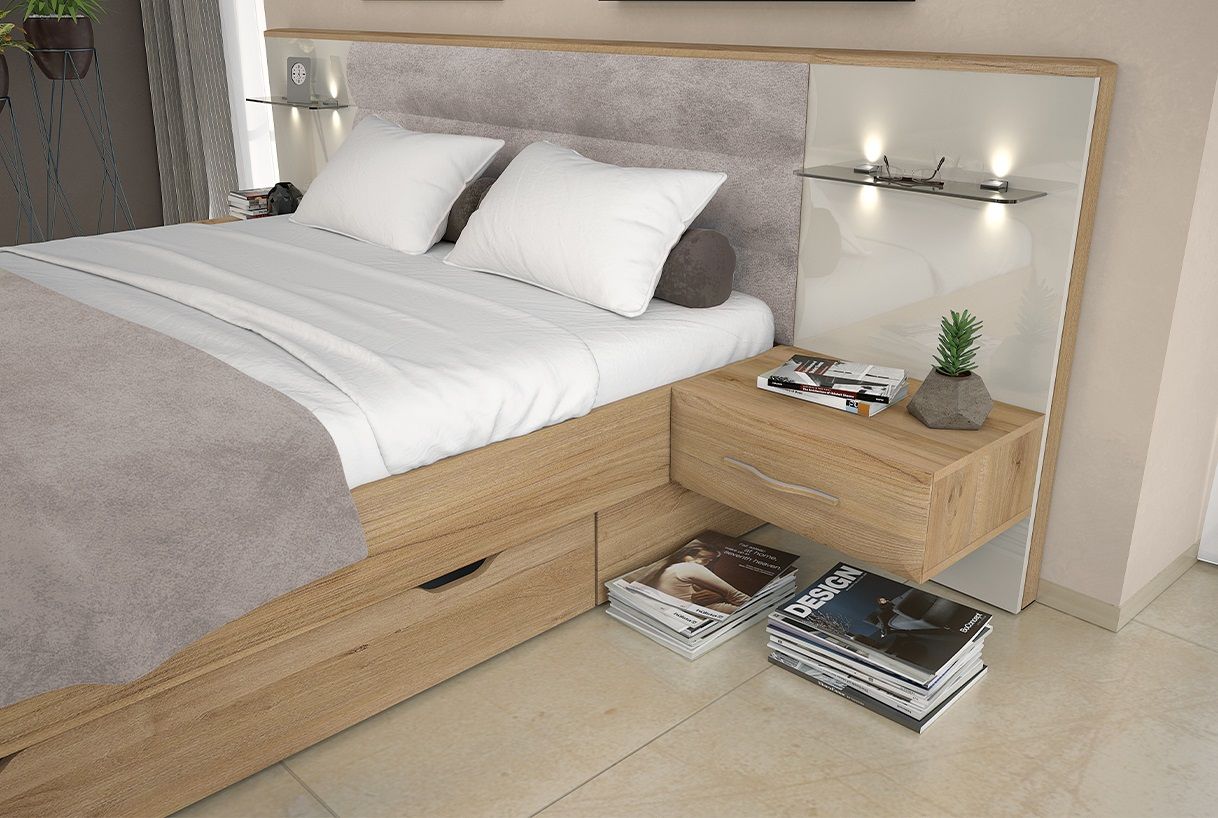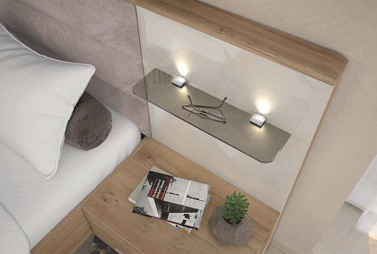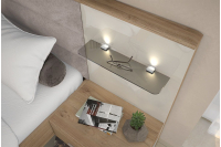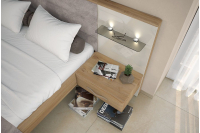 Nočne omarice: Zagotavljajo priročen prostor za shranjevanje knjig, svetilk in drugih manjših predmetov. Na voljo sta dva modela nočnih omaric: klasična nočna omarica z dvema predaloma ali stenska nočna omarica, katega ima predal, poličko in vgrajene LED luči.
