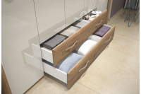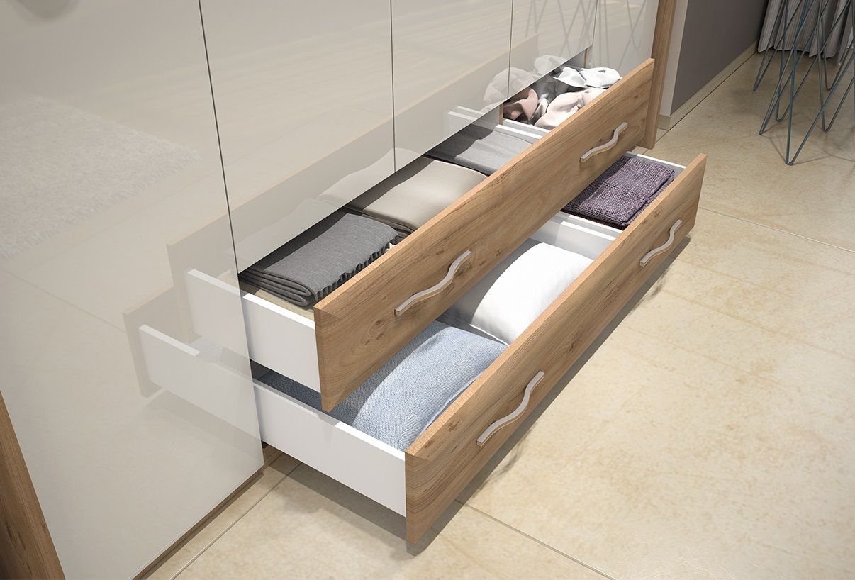 Drsna omara GALA je oblikovana z mislijo na maksimalno izrabo prostora. Sistem drsnih vrat omogoča preprosto odpiranje in zapiranje, tudi v manjših prostorih, kjer je vsaka dodatna površina dragocena. Notranjost omare je skrbno načrtovana, z različnimi policami, predali in obešalniki, kar omogoča organizirano shranjevanje oblačil in drugih predmetov.