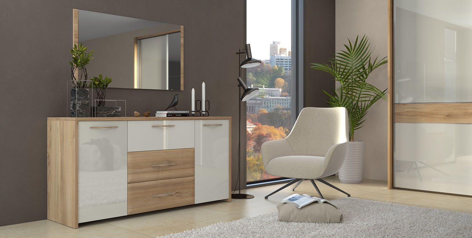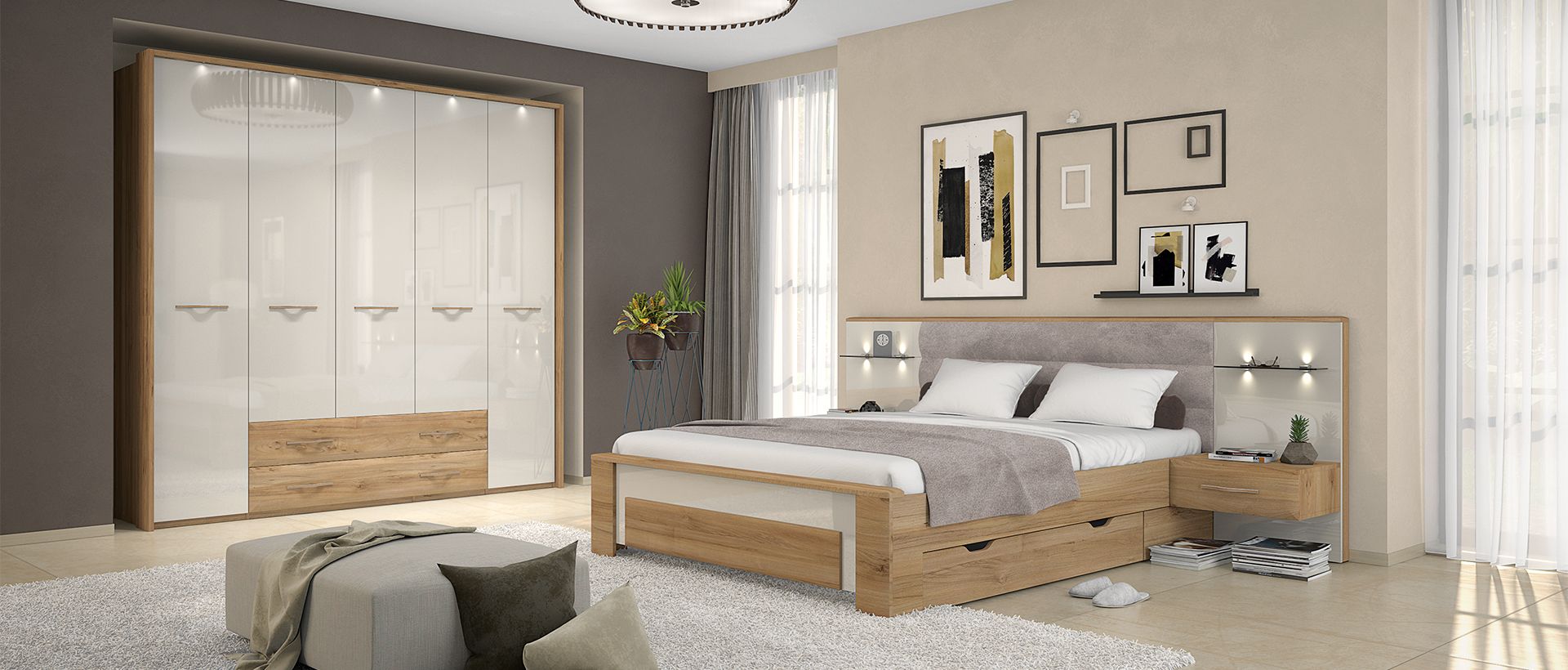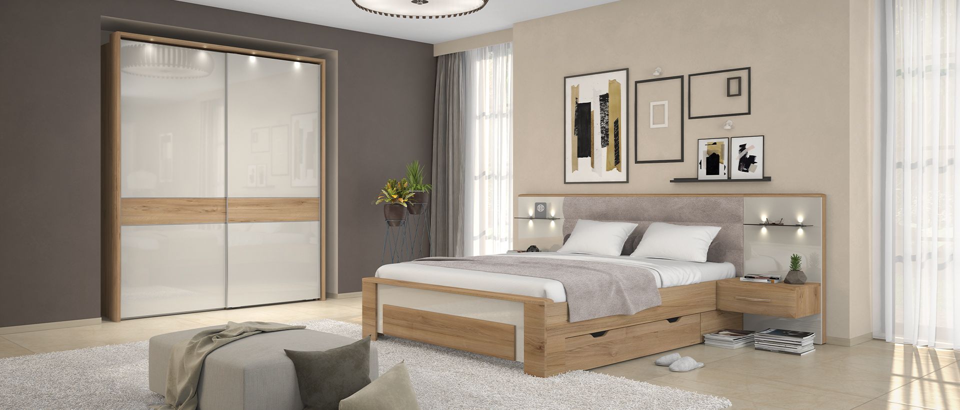 Spalnica GALA je popolna izbira za tiste, ki cenijo moderni dizajn s pridihom elegance. Čiste linije, nevtralne barve in premišljena izbira elementov ustvarjajo harmonično in pomirjujoče okolje. Drsna omara, ki je osrednji element spalnice, prinaša eleganten pridih in obenem povečuje funkcionalnost prostora. S svojo minimalistično zasnovo in visokokakovostnimi materiali, omara prispeva k sodobnemu videzu celotne sobe.