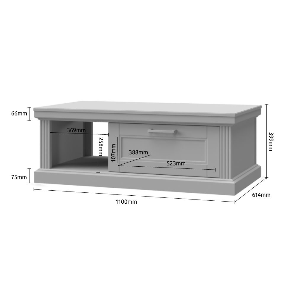 Klubska mizica iz pohištvene serije TARA. Mizica je kvalitetne izdelave in rustikalnega videza. Mizico sestavlja predal in odprt regal - polica. Kolekcija TARA je elegantnega videza z rustikalnimi dodatki. Pohištvo je kvalitetne izdelave, izdelano pri priznanem podjetju Jela. Pohištvena serija je na voljo v moderni grafitno sivi ali umirjeni beli v kombinaciji z lesnim dekorjem. Serija je primerna za vsak prostor, kjer želite vnesti moderno pohištvo s pridihom klasike. Po želji lahko element kombinirate z ostalimi elementi iz pohištvene serije Tara. Vso pohištvo iz serije Tara je opremljeno s sistemom mehkega zapiranja.