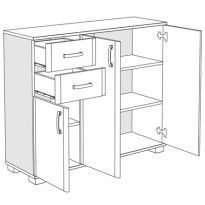 Primerna za vsak prostor. Na voljo v 3 barvah. Prostorna komoda je razdeljena na dva dela, v levem delu se nahajaza dva predala pod njima pa prostor s polico. V desnem delu se nahajata dve polici.