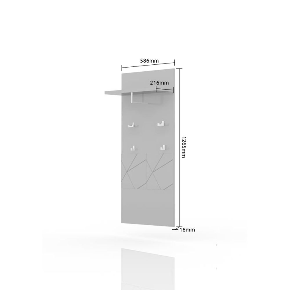 Stenski obešalnik iz kolekcije STELA v beli barvi visokega sijaja z lesnim dekorjem tabacco hrasta. Dimenzije: 59x126x22 cm.