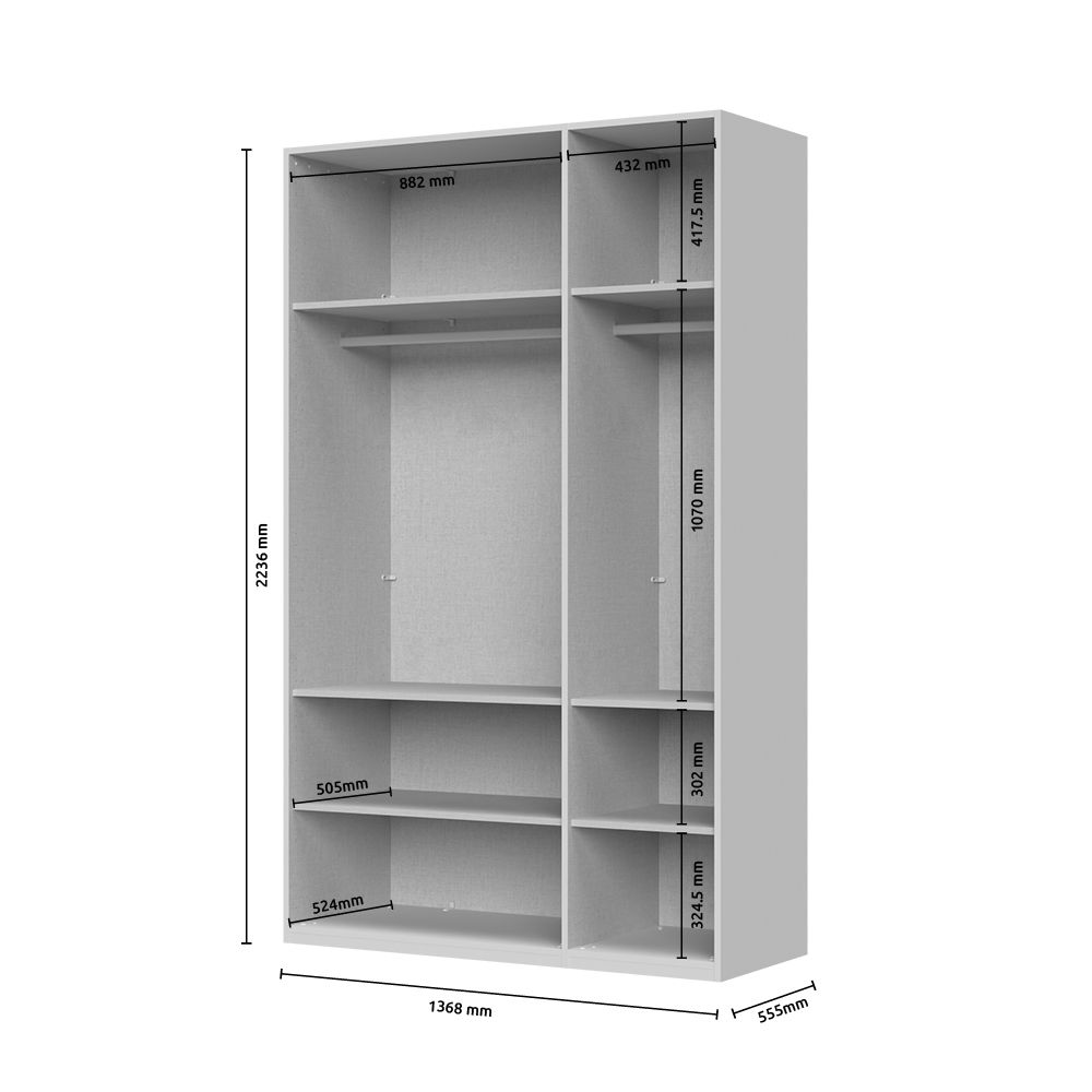 Tridelna omara z ogledalom iz pohištvene serije Opera. Omara ima dvoja polna vrata, ena vrata so z ogledalom. V notranjosti omare se nahajaja šest polic in dva droga za obešanje oblačil. Moderna umetnost - to je pohištvo Opera, ekskluzivna kolekcija proizvajalca Jela, ki jo navdihuje eleganten in prefinjen dizajn. Topla barva in mirna oblika kolekcije Opera bosta popestrili različne prostore vašega stanovanja. Poleg modernega dizajna so pri podjetju Jela poskrbeli tudi za odlično kvaliteto, funkcionalnost in modularnost. Pohištveni elementi Opera so kvalitetne izdelave, izdelani iz 18mm univerja. Robovi so zaključeni z Rehau robnim trakom. Zunanjost pohištvenih elementov je lakirana z UV lakom v nežni soft mat kašmir barvi. Vrata imajo poudarjene profilirane letve v MDF, kar ustvari učinek okvirja. Notranjost je v zanimivem tekstilnem dekorju. Ročaji v rjavi Cortado barvi s svojim toplim odtenkom in rahlo ukrivljeno obliko lepo poudarjajo videz celotne kolekcije. Vsi elementi iz serije Opera so opremljeni s sistemom mehkega zapiranja.
