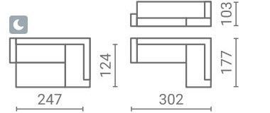 Sedežna garnitura v obliki črke L, za vse tiste, ki želite popestriti prostor s preprosto, moderno sedežno garnituro. Sedežna ima širok počivalnik, vsebuje tudi ležišče in dvižni predal. Dimenzije (š/g/v): 302 x 177 x 103 cm.