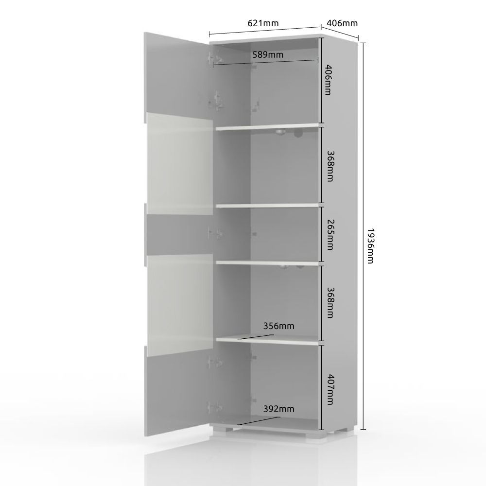Vitrina iz kolekcije STELA, na voljo v beli barvi visokega sijaja z lesnim dekorjem tabacco hrasta. Dimenzije: 62 x 194 x 41 cm.