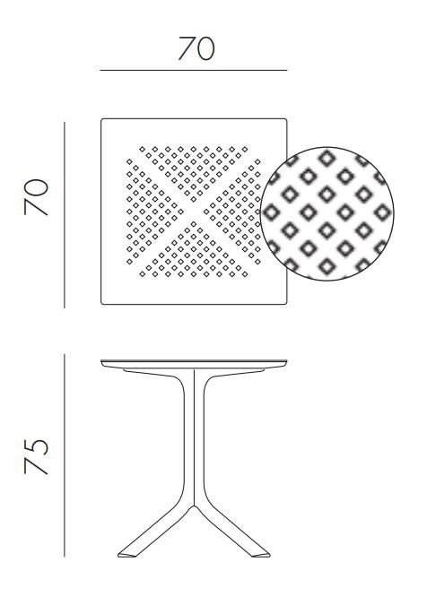 Posebej zasnovana kvadratna vrtna miza CLIP 70 priznanega italijanskega proizvajalca Nardi. Namenjena je predvsem za uporabo v majhnih prostorih; terasah stanovanj, restavracij, barov. Vrtno mizo lahko uporabite v zunanjih in notranjih prostorih. Miza Clip 70 ima štirikrako osrednjo podporno nogo in mizno ploščo DurelTop iz polipropilena ojačanega s steklenimi vlakni. Ploščo krasi perforiran vzorec z okroglimi luknjicami. Površina je na otip prijetna z mat videzom. Naročite jo lahko v beli, antracit, svetlo ali temno rjavi in zeleni barvi. Po končani uporabi je izdelek mogoče reciklirati. Polypropylen fiberglass: lahek, dolgotrajen, nestrupen in antistatičen material, odporen na zunanje vremenske vplive. Material je obdelan z anti-UV sredstvi in je enakomerno obarvan z netoksičnimi pigmenti. Vzdrževanje: izdelek operite z vodo, da odstranite morebitno površinsko umazanijo in prah; površino popršite z Magic Cleaner Nardi ali neagresivnim univerzalnim čistilom; pustite delovati nekaj minut, nato izperite z vodo ali obrišite z vlažno krpo ali gobo; posušite s suho krpo.